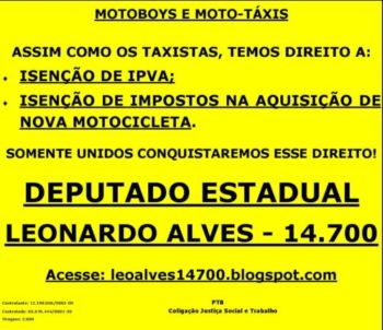 - Isenção de Impostos para os Motoboys e Moto-taxistas. Se analisarmos, o serviço do Motoboy se transformou de utilidade pública. Se não existisse esse profissional, como seriam as entregas das farmácias, restaurantes, lanchonetes, etc? O profissional da moto veio para ficar, portanto precisa se unir para garantir seus direitos e regulamentação. Defendo que, assim como os taxistas, os motoboys tenham: